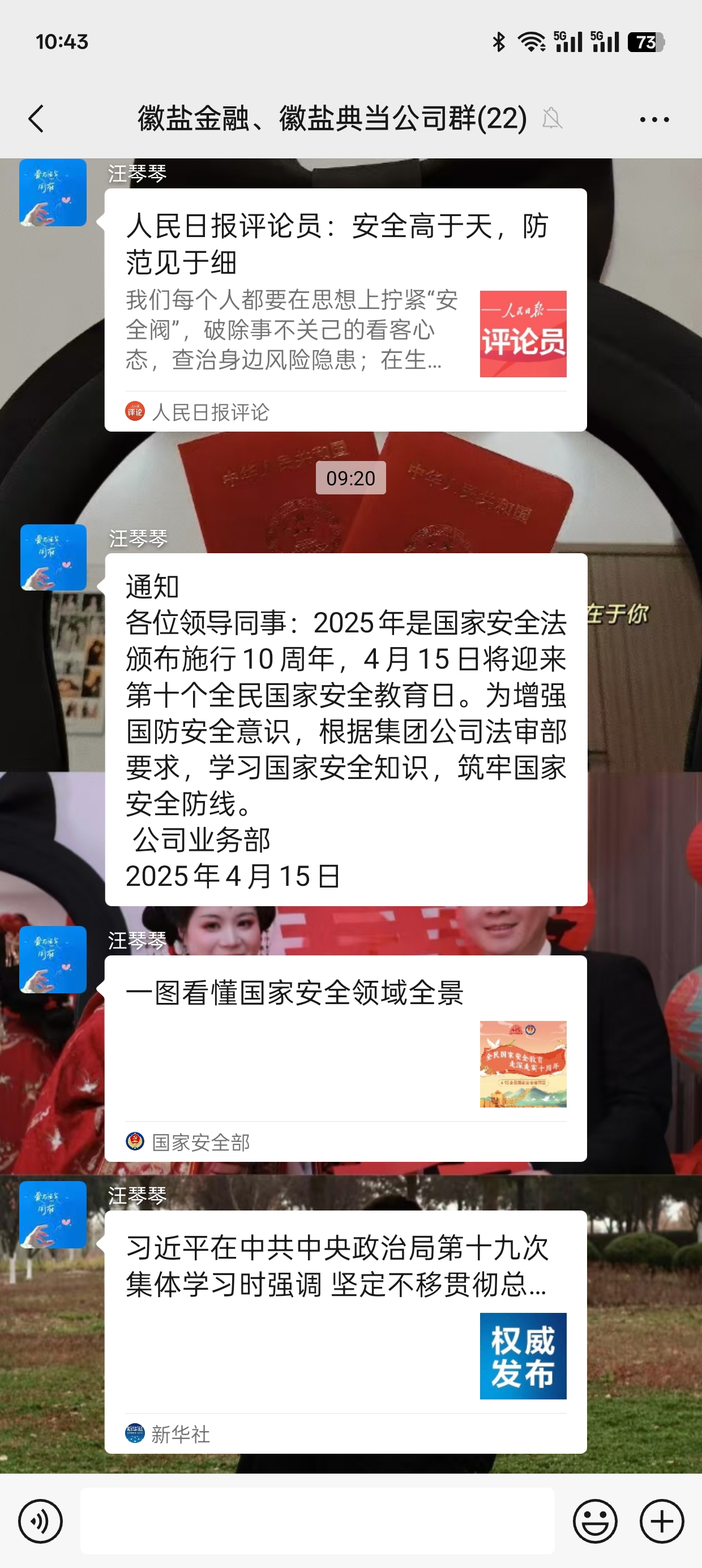 地產(chǎn)集團微信群每日推送國家安全知識圖解、微視頻,以“碎片化學習”提升普法滲透力;集團公司、環(huán)境科技集團微信公眾號發(fā)布專題推文《國家安全,你我同行》,通過案例剖析、法條鏈接等形式,生動解讀《國家安全法》《反間諜法》;徽鹽金融等子公司組織線上答題活動,覆蓋全員,以考促學鞏固國家安全基礎知識,參與率達100%。