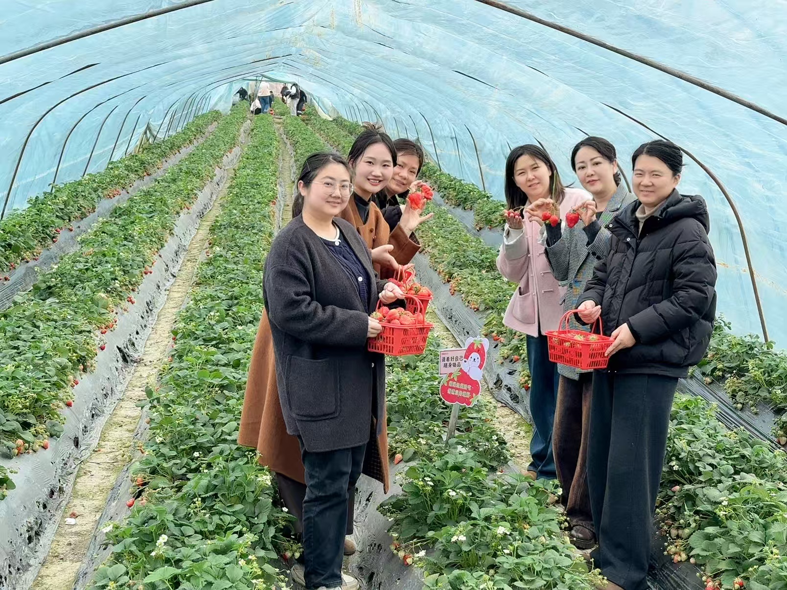 活動(dòng)當(dāng)天,陽(yáng)光明媚,暖意融融。走進(jìn)采摘大棚,清新果香撲面而來,翠綠藤蔓間,顆顆草莓鮮紅飽滿,在春光的映照下格外誘人。在工作人員講解采摘技巧后,大家手提果籃,化身田園體驗(yàn)館,彎腰親摘、細(xì)心挑選,一遍分享心得、一邊拍照打卡,沉浸式體驗(yàn)著采摘帶來的快樂與成就感,將工作的疲憊與生活的瑣碎都消散在這片清甜之中。
