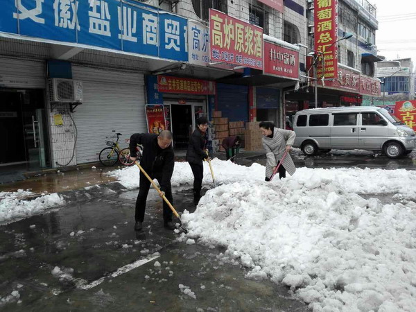 下午黨支部組織黨員干部及職工進(jìn)行義務(wù)除雪勞動。不但鏟除公司門前的積雪,還進(jìn)行漕沖糖酒城市場路面積雪清除,以培養(yǎng)黨員的宗旨意識和奉獻(xiàn)精神。