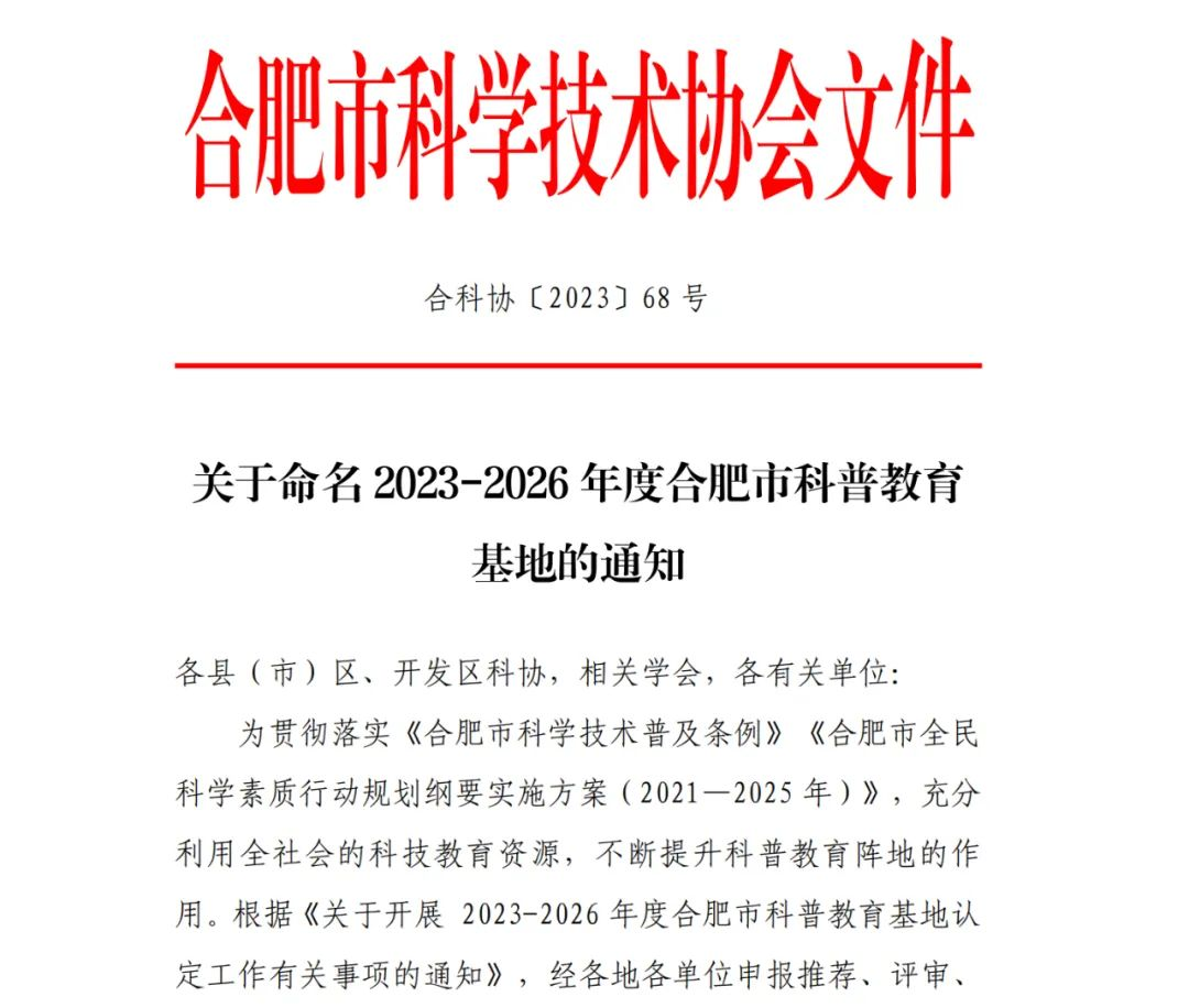 9月21日,合肥市科學(xué)技術(shù)協(xié)會(huì)經(jīng)各地各單位申報(bào)推薦、評(píng)審、驗(yàn)收、公示等程序,正式發(fā)文公布命名合肥鹽業(yè)等126家場(chǎng)館為“2023-2026年度合肥市科普教育基地”。