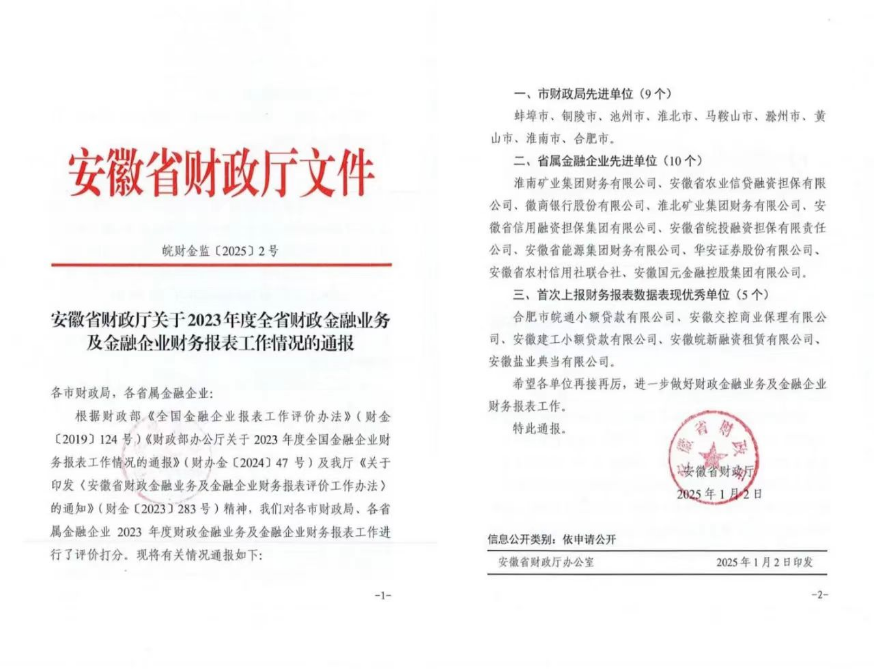 近日,安徽省財(cái)政廳依據(jù)《全國(guó)金融企業(yè)報(bào)表工作評(píng)價(jià)辦法》等相關(guān)文件精神,對(duì)各市財(cái)政局和省屬金融企業(yè)2023年度財(cái)政金融業(yè)務(wù)及金融企業(yè)財(cái)務(wù)報(bào)表工作進(jìn)行了評(píng)價(jià)?;整}典當(dāng)公司榮獲“首次上報(bào)財(cái)務(wù)報(bào)表數(shù)據(jù)表現(xiàn)優(yōu)秀單位”榮譽(yù)稱號(hào)。